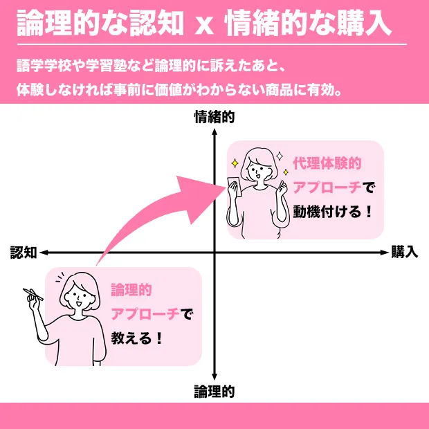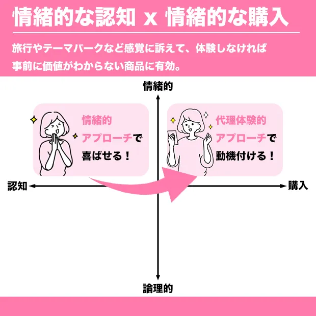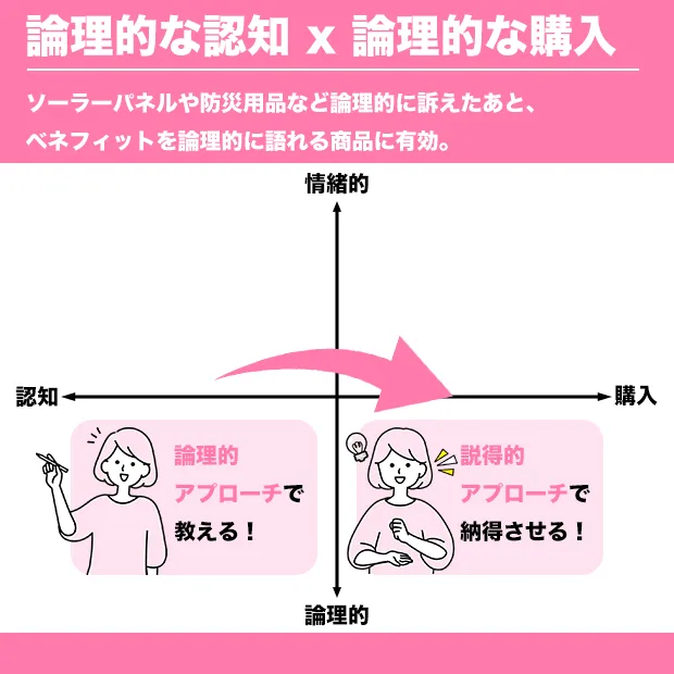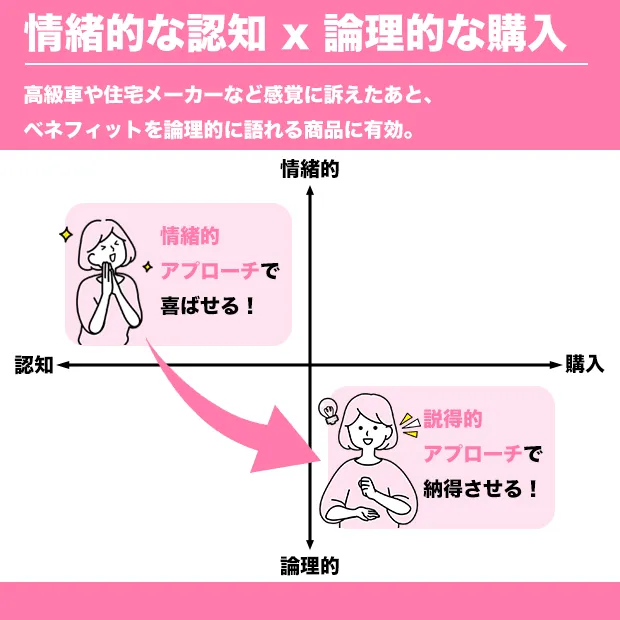 縦軸は情緒的か論理的かという視点、そして横軸は認知段階か購入段階かという視点になります。