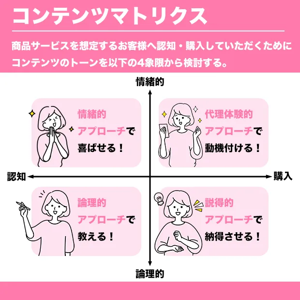 今回は、このコンテンツマトリクスを使用してどのような商品サービスにどのようなアプローチが適切かをご紹介します。