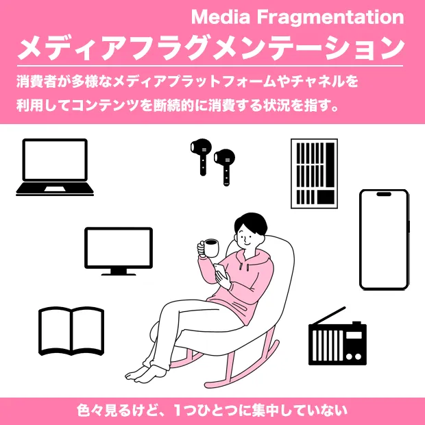 メディアフラグメンテーションとは、消費者が多様なメディアプラットフォームやチャネルを利用してコンテンツを断片的に消費している状況を指す。冒頭の私のエピソードのようにテレビを見ながら、スマホを触る方も多いと思われる。消費者は様々なメディアに瞬時に触れられるようになたったために1つひとつのコンテンツ消費が断片的になってしまっているのである。集中力が続かないという個人の問題ではなく、瞬時に短時間でアクセスできるメディアに溢れているのである。
