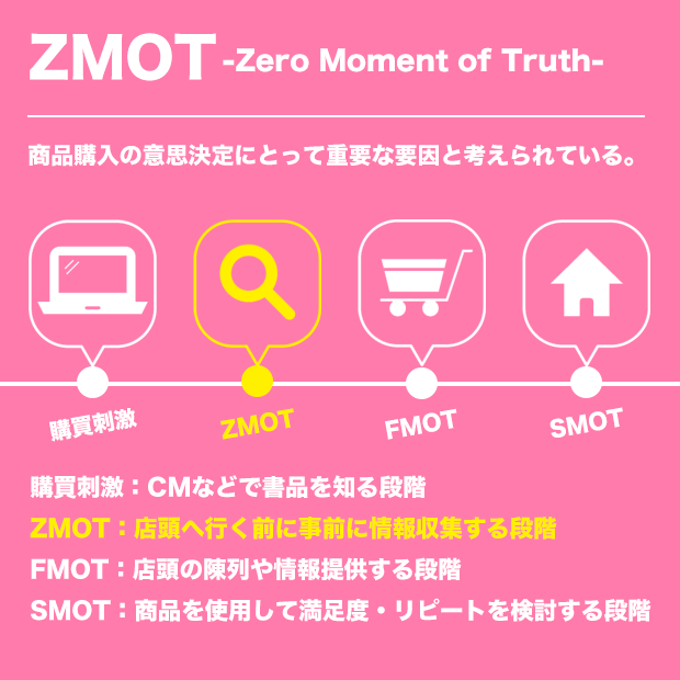 さてGoogle社が2011年ごろにZMOT(Zero Moment of Truth)という考えを提唱した。これは消費者が購買プロセスの中で、どの段階で得た情報を重要視しているか?という考え方が元となっている。それまでは、FMOT(First Moment of Truth)の段階での情報提供が特に重要と考えられてきたが、今(といっても10年以上前)の時代は、もっと手前の段階が大事だとする新しい考え方であった。