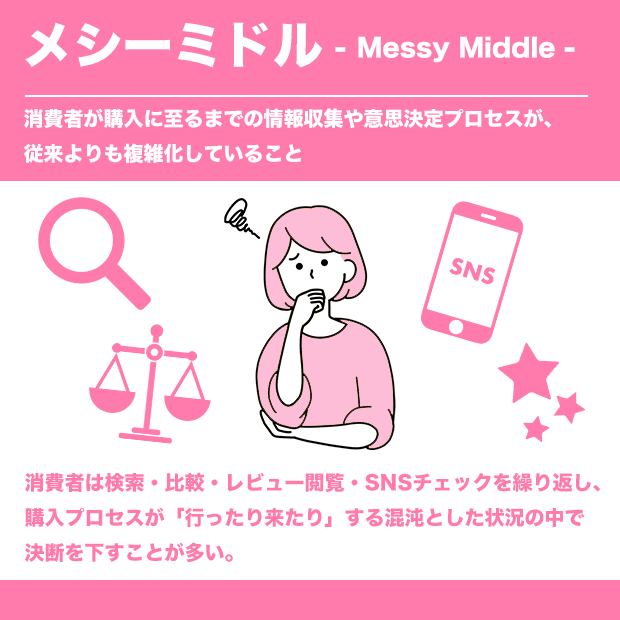 メシーミドルは、消費者が購入に至るまでの情報収集や意思決定プロセスが、従来よりも複雑化していることを指す。さきほどのZMOTやマイクロモーメントに考え方が似ているが、こちらは消費者の情報収集の多様化と行動の予測不可能性を強調しているものである。消費者は、検索・比較・レビュー閲覧・SNSのチェックなど様々な形での情報収集を繰り返し、購入プロセスが行ったり来たりする混沌とした状況(messy)の中で購入の決断を下すことが多くなっているというものだ。インターネットでの検索が容易になったことで、瞬間的かつ混沌とした予測不能な情報収集が行われた結果、特定の店舗(または企業)での購入決定がなされてしまっている。