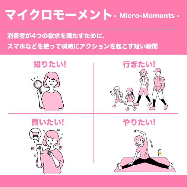 その一つが、マイクロモーメント(Micro Moments)だ。これは、ZMOTの考え方が進化した形で消費者が「知りたい」「行きたい」「買いたい」「やりたい」といった欲求を満たすために、スマートフォンやパソコンを使って瞬時にアクションを起こす短い瞬間のことを指す。消費者は必ずしもじっくり計画立てて情報収集しているわけではないので、欲求が起こったその瞬間に良さそうな答えを求めている。